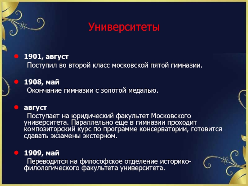 в гимназии проходит композиторский курс по программе консерватории, готовится сдавать экзамены экстерном.
