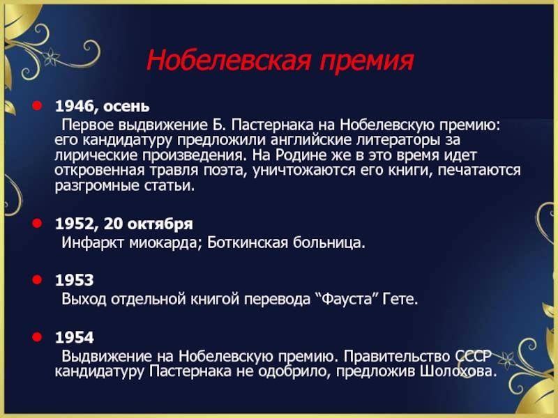 Выдвижение на Нобелевскую премию. Правительство СССР кандидатуру Пастернака не одобрило, предложив Шолохова.