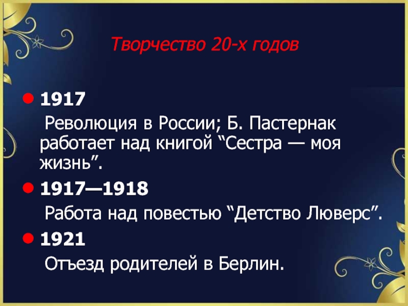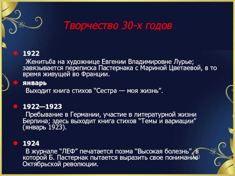 Пребывание в Германии, участие в литературной жизни Берлина; здесь выходит книга стихов “Темы и вариации” (январь 1923).