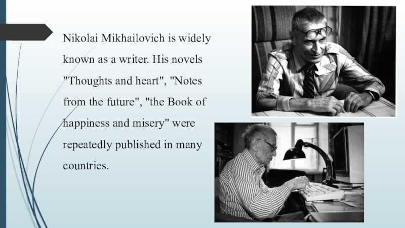 Слайд 9Nikolai Mikhailovich is widely known as a writer. His novels