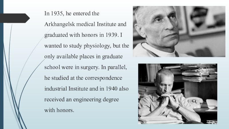 Слайд 4In 1935, he entered the Arkhangelsk medical Institute and graduated