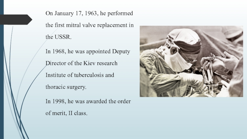 On January 17, 1963, he performed the first mitral valve replacement in the USSR.In 1968, he was
