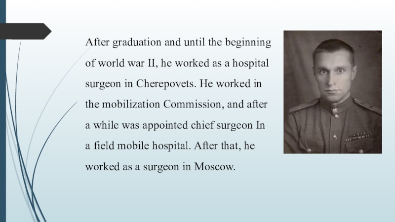 in the mobilization Commission, and after a while was appointed chief surgeon In a field mobile hospital. After that, he worked as a surgeon in Moscow.