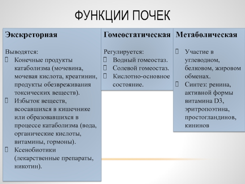 Синтез: ренина, активной формы витамина D3, эритропоэтина, простогландинов, кининов