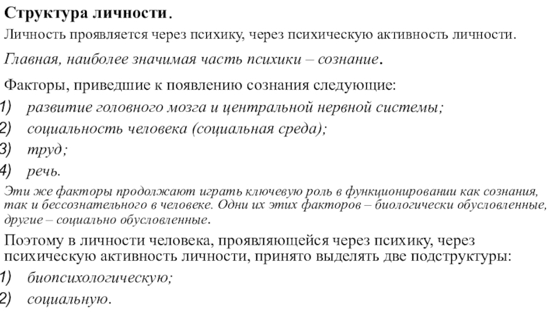 Эти же факторы продолжают играть ключевую роль в функционировании как сознания, так и бессознательного в человеке. Одни их этих факторов – биологически обусловленные, другие – социально обусловленные.
