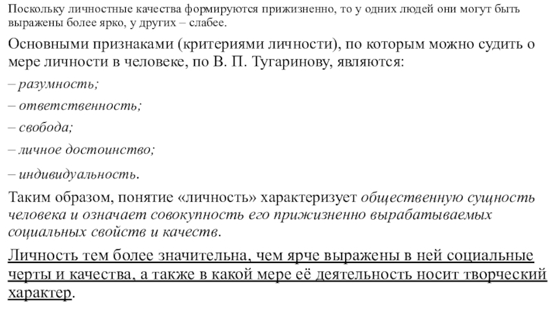 (критериями личности), по которым можно судить о мере личности в человеке, по В. П. Тугаринову, являются: