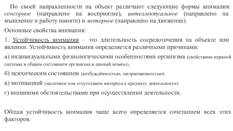 1. Устойчивость внимания – это длительность сосредоточения на объекте или явлении. Устойчивость внимания определяется различными причинами: