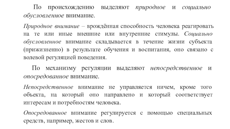 Слайд 49 По происхождению выделяют природное и социально обусловленное внимание.