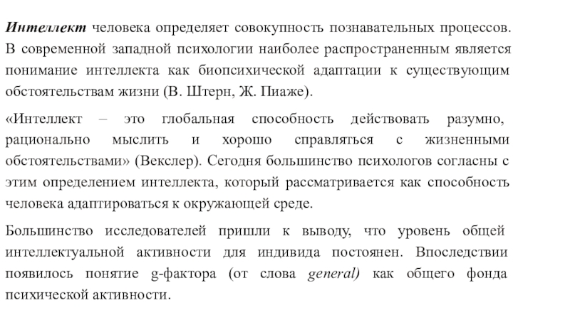 «Интеллект – это глобальная способность действовать разумно, рационально мыслить и хорошо справляться с жизненными обстоятельствами» (Векслер). Сегодня большинство психологов согласны с этим определением интеллекта, который рассматривается как способность человека адаптироваться к окружающей среде.