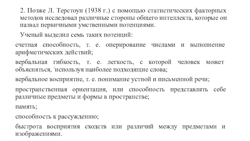 Слайд 552. Позже Л. Терстоун (1938 г.) с помощью статистических факторных