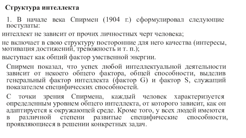 Спирмен показал, что успех любой интеллектуальной деятельности зависит от некоего общего фактора, общей способности, выделив генеральный фактор интеллекта (фактор G) и фактор S, служащий показателем специфических способностей.