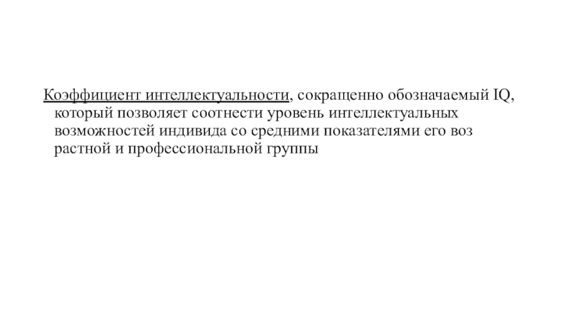 Слайд 56Коэффициент интеллектуальности, сокращенно обозначаемый IQ,который позволяет соотнести уровень интеллектуальных возможностей