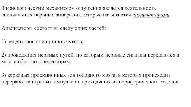 Физиологическим механизмом ощущения является деятельность специальных нервных аппаратов, которые называются