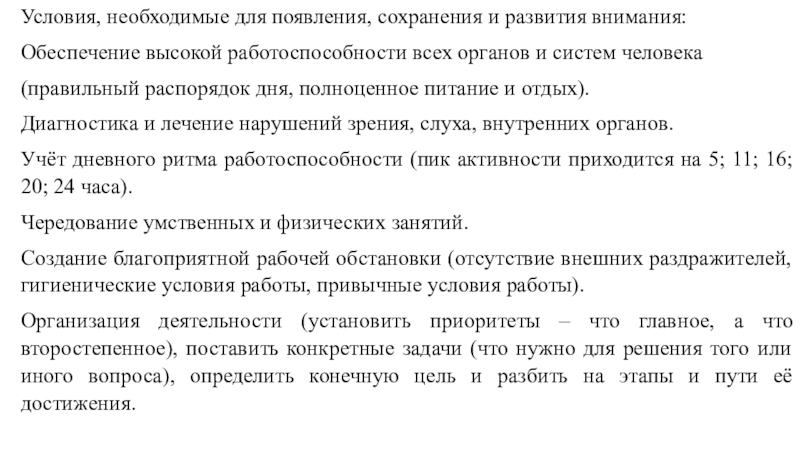 Слайд 52Условия, необходимые для появления, сохранения и развития внимания: