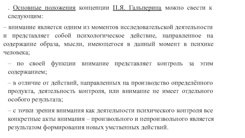 – с точки зрения внимания как деятельности психического контроля все конкретные акты внимания – произвольного и непроизвольного является результатом формирования новых умственных действий.