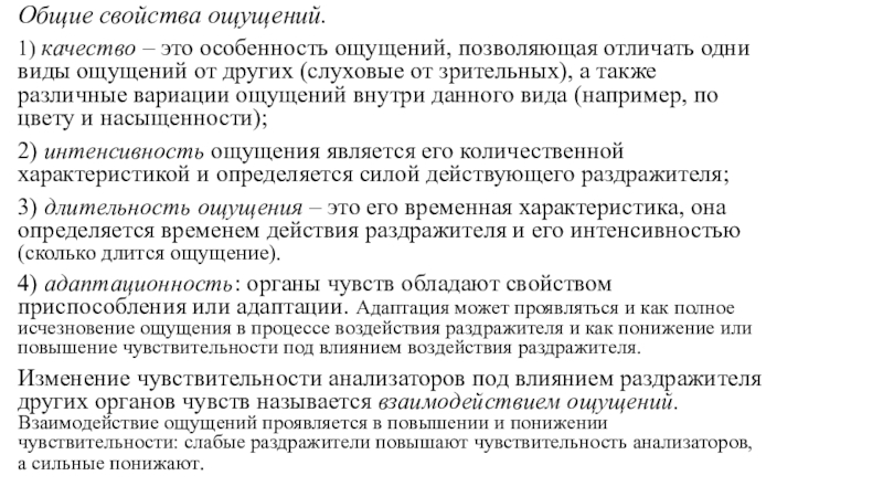 С одной стороны, ощущения объективны, т.к. в них всегда отражён внешний раздражитель, а с другой стороны, они субъективны, поскольку зависят от состояния нервной системы и индивидуальных особенностей человека.