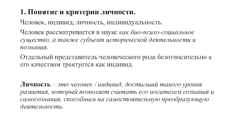 Личность – это человек / индивид, достигший такого уровня развития, который позволяет считать его носителем сознания и самосознания, способным на самостоятельную преобразующую деятельность.
