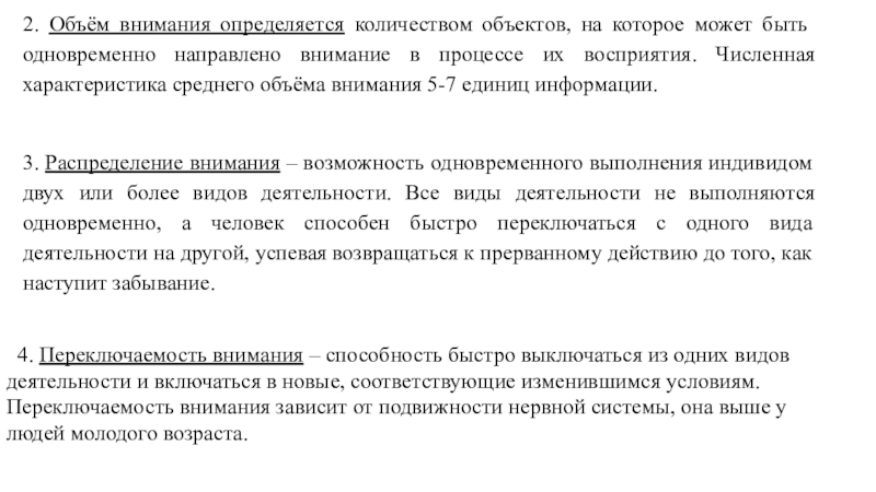 4. Переключаемость внимания – способность быстро выключаться из одних видов деятельности и включаться в новые, соответствующие изменившимся условиям. Переключаемость внимания зависит от подвижности нервной системы, она выше у людей молодого возраста.