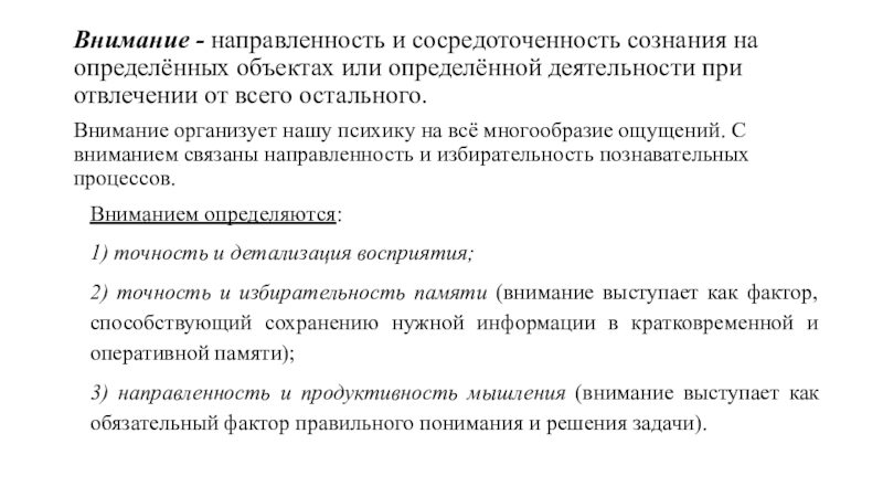 на всё многообразие ощущений. С вниманием связаны направленность и избирательность познавательных процессов.