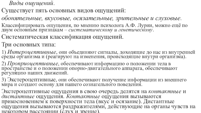 Классифицировать ощущения, по мнению психолога А.Ф. Лурии, можно ещё