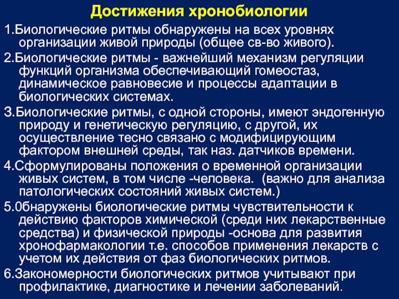 5.0бнаружены биологические ритмы чувствительности к действию факторов химической (среди них лекарственные средства) и физической природы -основа для развития хронофармакологии т.е. способов применения лекарств с учетом их действия от фаз биологических ритмов.