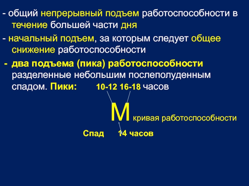 Слайд 10- общий непрерывный подъем работоспособности в течение большей части дня