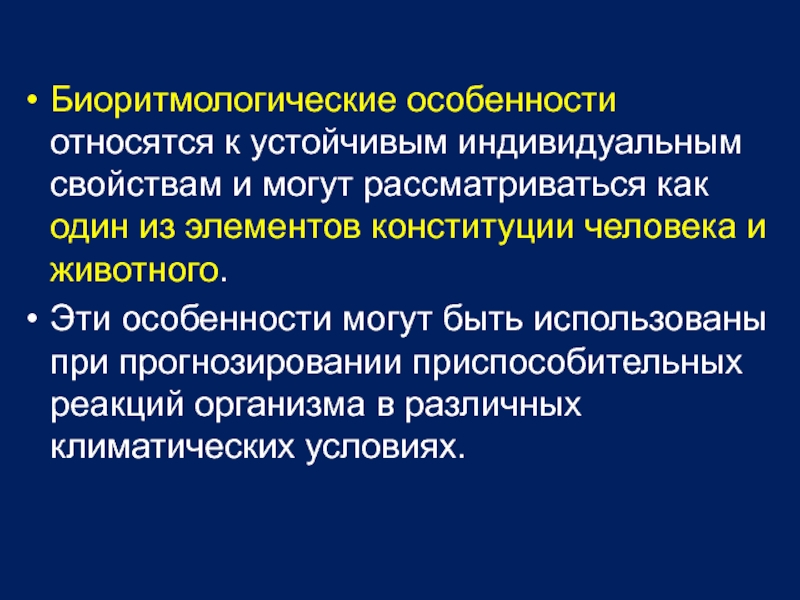 Слайд 13Биоритмологические особенности относятся к устойчивым индивидуальным свойствам и могут рассматриваться