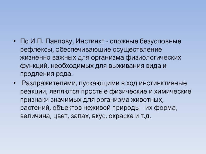 Слайд 51По И.П. Павлову, Инстинкт - сложные безусловные рефлексы, обеспечивающие осуществление