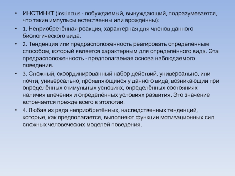 Слайд 52ИНСТИНКТ (instinctus - побуждаемый, вынуждающий, подразумевается, что такие импульсы естественны