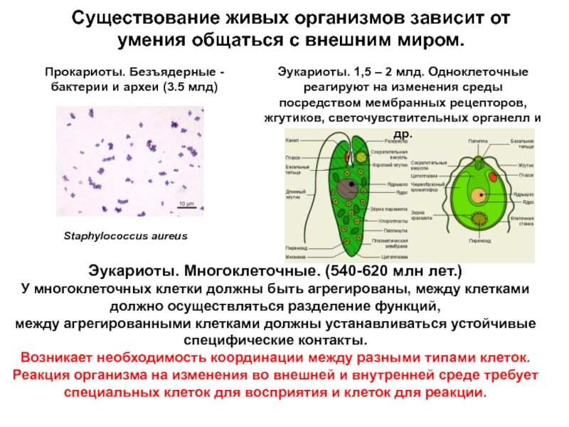 Эукариоты. 1,5 – 2 млд. Одноклеточные реагируют на изменения среды посредством мембранных рецепторов, жгутиков, светочувствительных органелл и др.