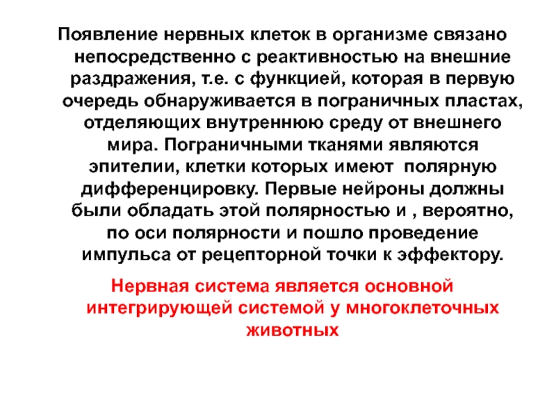 Слайд 4Появление нервных клеток в организме связано непосредственно с реактивностью на