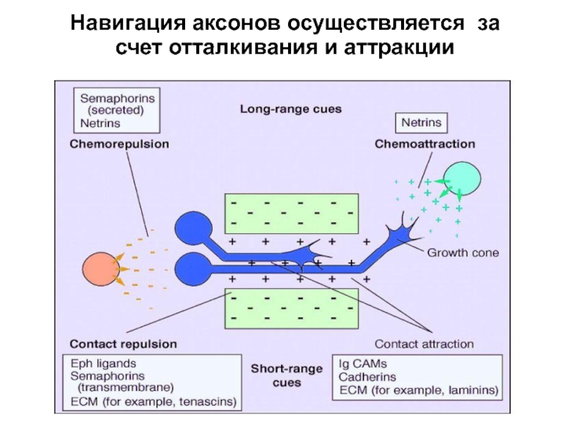 Слайд 68Навигация аксонов осуществляется за счет отталкивания и аттракции
