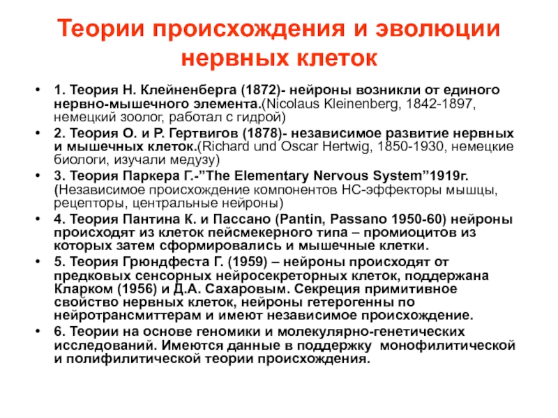Слайд 5Теории происхождения и эволюции нервных клеток