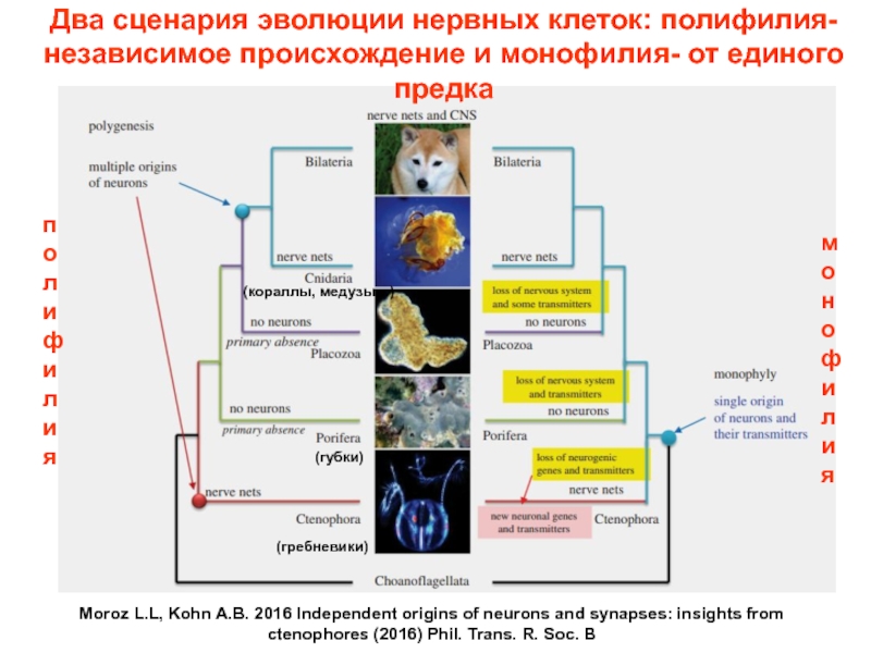 Слайд 12Два сценария эволюции нервных клеток: полифилия- независимое происхождение и монофилия-
