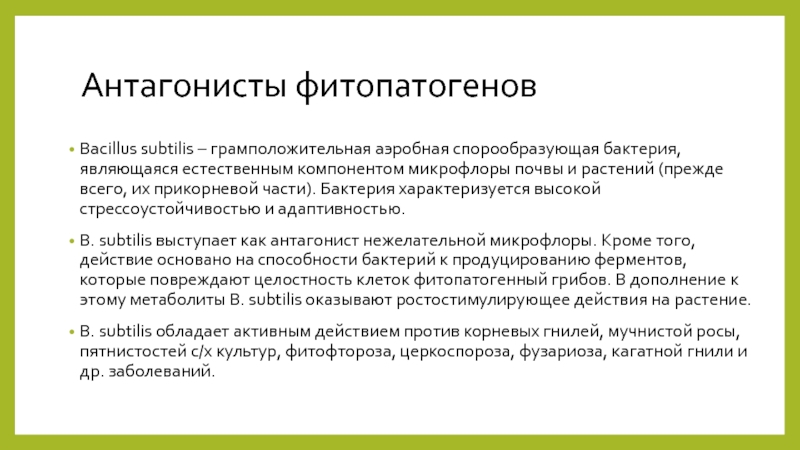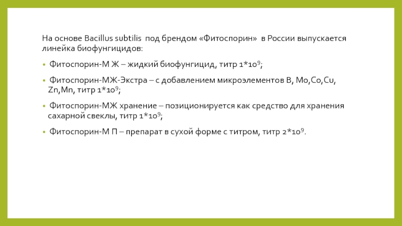 Слайд 44На основе Bacillus subtilis под брендом «Фитоспорин» в России выпускается