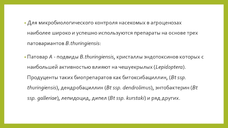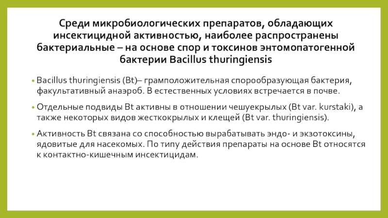 Слайд 33Среди микробиологических препаратов, обладающих инсектицидной активностью, наиболее распространены бактериальные –