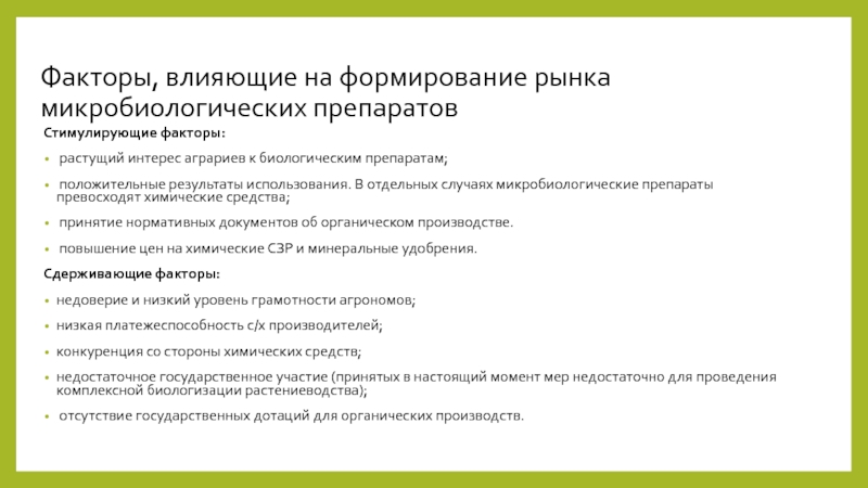 Слайд 6Факторы, влияющие на формирование рынка микробиологических препаратов