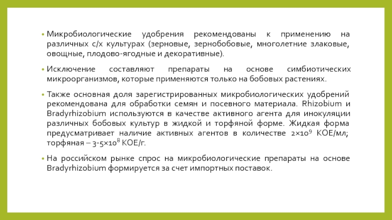 Слайд 14Микробиологические удобрения рекомендованы к применению на различных с/х культурах (зерновые,
