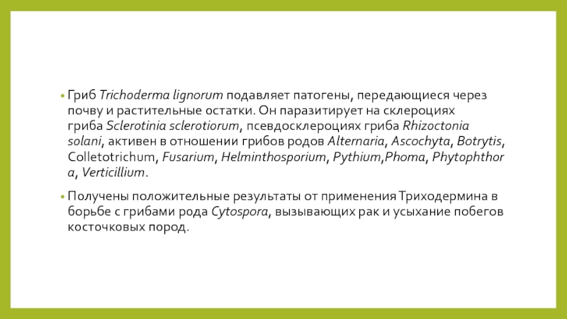 Слайд 50Гриб Trichoderma lignorum подавляет патогены, передающиеся через почву и растительные остатки. Он