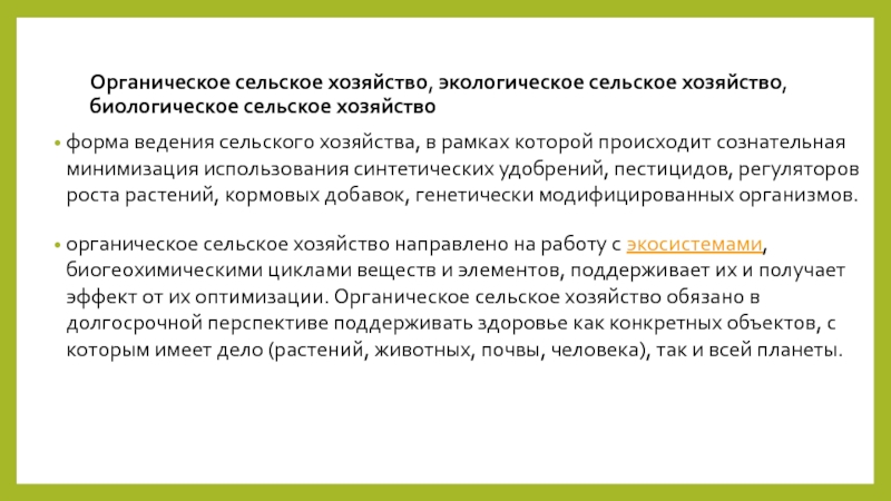 Слайд 3Органическое сельское хозяйство, экологическое сельское хозяйство, биологическое сельское хозяйство