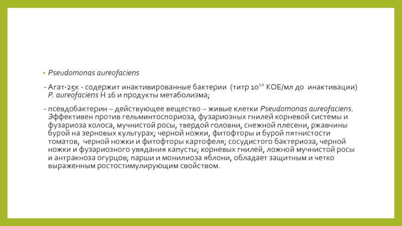 - псевдобактерин – действующее вещество – живые клетки Pseudomonas aureofaciens. Эффективен против гельминтоспориоза, фузариозных гнилей корневой системы и фузариоза колоса, мучнистой росы, твердой головни, снежной плесени, ржавчины бурой на зерновых культурах; черной ножки, фитофторы и бурой пятнистости томатов, черной ножки и фитофторы картофеля; сосудистого бактериоза, черной ножки и фузариозного увядания капусты; корневых гнилей, ложной мучнистой росы и антракноза огурцов; парши и монилиоза яблони, обладает защитным и четко выраженным ростостимулирующим свойством.