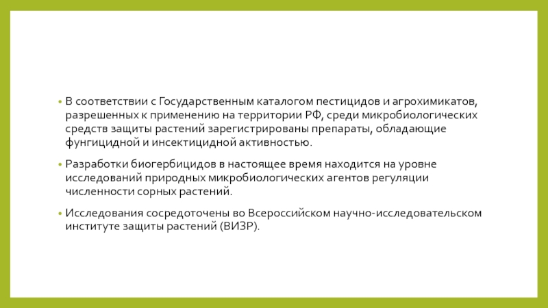 2. Микробиологические средства защиты растений – препараты, содержащие живые микроорганизмы и метаболиты, продуцируемые ими, оказывающие супрессивное действие на вредные организмы, в первую очередь грибы, бактерии и насекомых.