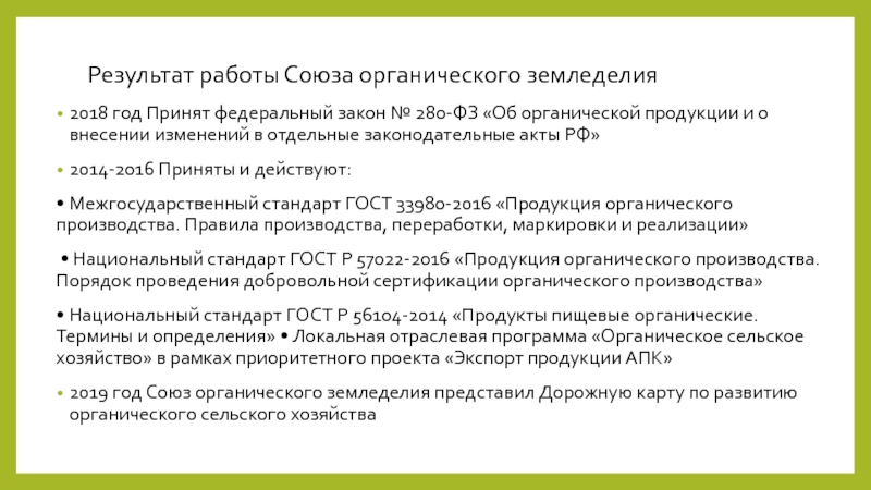 • Национальный стандарт ГОСТ Р 56104-2014 «Продукты пищевые органические. Термины и определения» • Локальная отраслевая программа «Органическое сельское хозяйство» в рамках приоритетного проекта «Экспорт продукции АПК»
