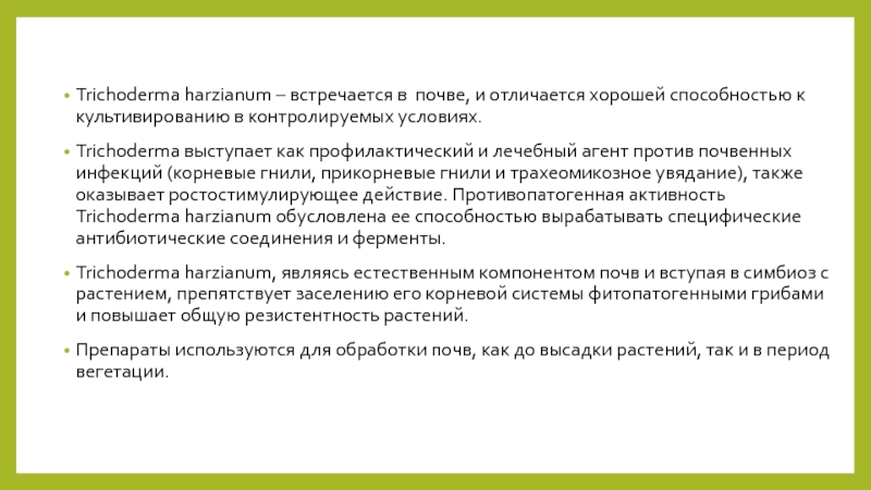 Слайд 48Trichoderma harzianum – встречается в почве, и отличается хорошей способностью