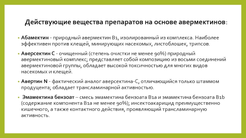 Слайд 39Действующие вещества препаратов на основе авермектинов: