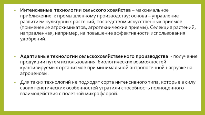 Слайд 2Интенсивные технологии сельского хозяйства – максимальное приближение к промышленному производству;