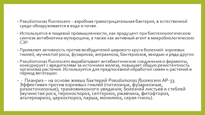 Pseudomonas fluorescens вырабатывает антибиотические соединения и ферменты, конкурирует с вредителями за источники железа, повышает общую резистентность организма растения. Используется для предпосевной обработки семян и растений в период вегетации.