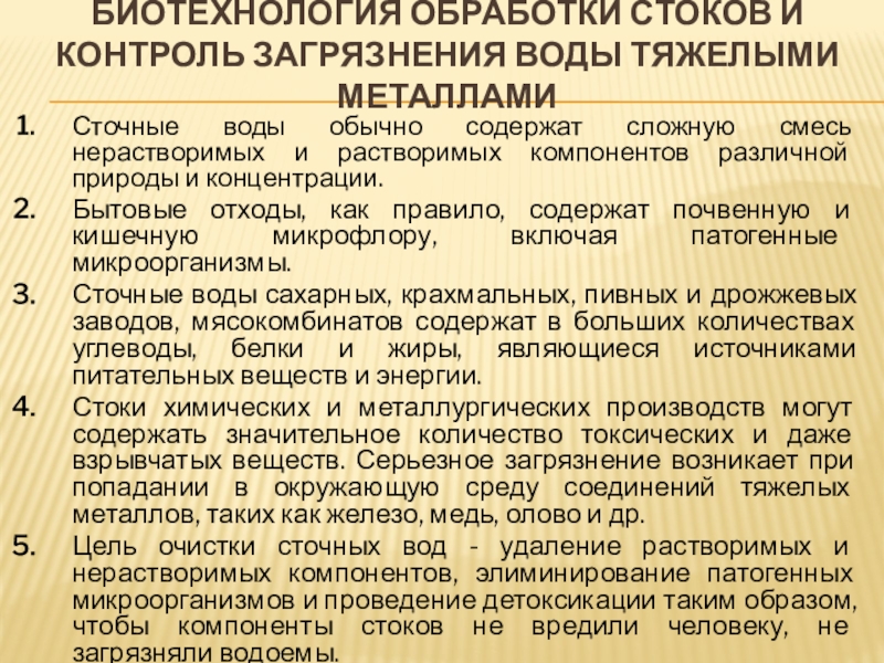 Биотехнология обработки стоков и контроль загрязнения воды тяжелыми металлами