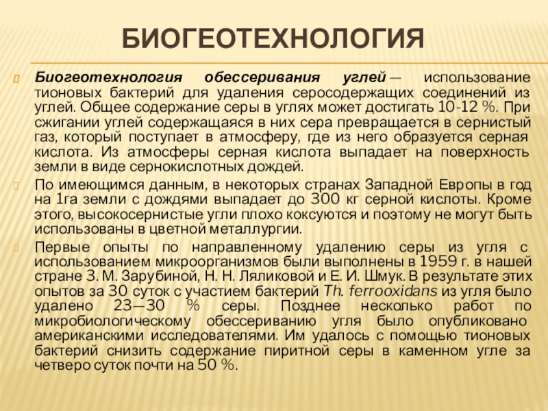 Первые опыты по направленному удалению серы из угля с использованием микроорганизмов были выполнены в 1959 г. в нашей стране 3. М. Зарубиной, Н. Н. Ляликовой и Е. И. Шмук. В результате этих опытов за 30 суток с участием бактерий Th. ferrooxidans из угля было удалено 23—30 % серы. Позднее несколько работ по микробиологическому обессериванию угля было опубликовано американскими исследователями. Им удалось с помощью тионовых бактерий снизить содержание пиритной серы в каменном угле за четверо суток почти на 50 %.