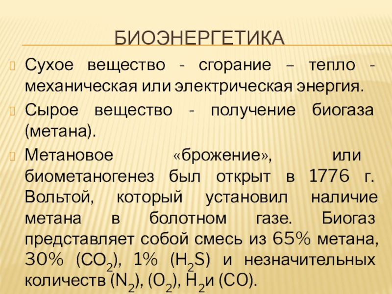 открыт в 1776 г. Вольтой, который установил наличие метана в болотном газе. Биогаз представляет собой смесь из 65% метана, 30% (СО2), 1% (Н2S) и незначительных количеств (N2), (O2), H2и (CO).